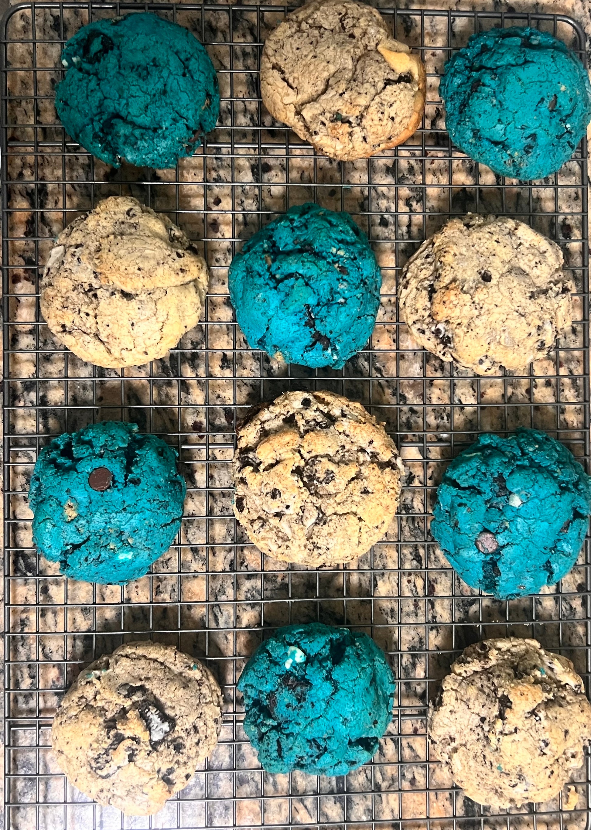 6 of our famous Cookie Monster and 6 Cookies N Cream cookies.